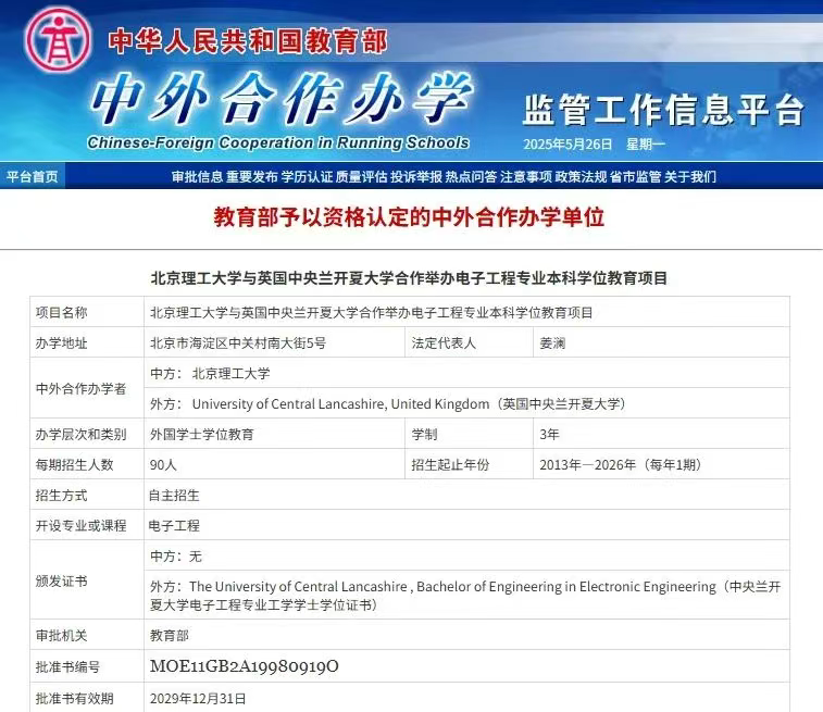 学生注册为英国中央兰开夏大学学籍,采用英国本科三年学制,授予英国电子工程专业学士学位。学生毕业后第四年可以申请英国名校攻读研究生,也就是说用4年的时间可以获得本科和硕士学位,大大节省时间成本和留学费用。在留学成本越来越高的背景下,这种低成本、低门槛获海外文凭的方式,已经成为不少学生和家长的折中选择。